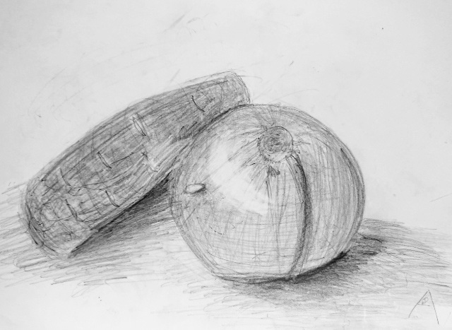 《たまねぎとにんじんのデッサン》 鉛筆/ケント紙 A4(21.0㎝×29.7㎝)